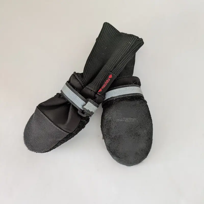 J’ai acheté les Muttluks de Maya à l’hiver 2021, quand elle avait 12 ans. Avant cela, la neige ne la dérangeait pas, mais elle a commencé à « danser » par grand froid, levant ses pattes et refusant d’avancer. Avec les années, sa sensibilité a augmenté : elle n’en avait besoin qu’à -35°C auparavant, mais maintenant, à presque 17 ans, elle les porte dès qu’il fait -15°C. J’aime ces bottes car elles offrent chaleur et adhérence tout en restant souples. Au début, il m’est arrivé d’en perdre une, mais une fois notre routine d’habillage établie et la tension des sangles maîtrisée, elles tiennent parfaitement. Elle utilise encore sa paire originale !