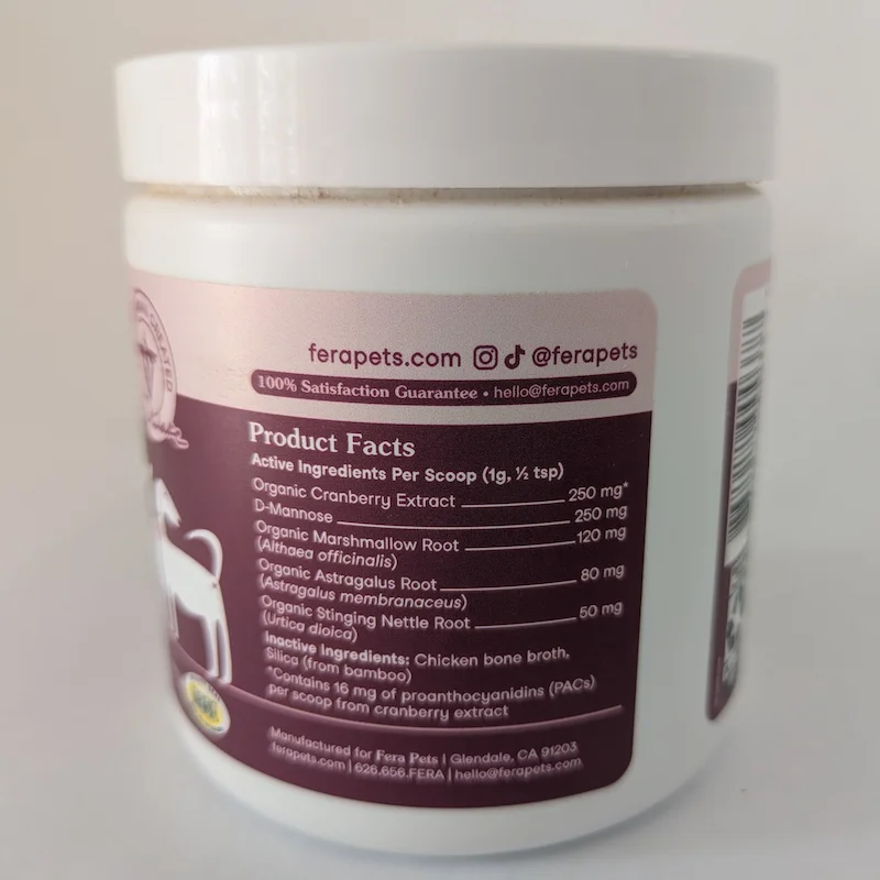 L’incontinence de Maya a progressé de manière significative tout au long de l’année 2025, passant d’épisodes occasionnels à un état constant. Pour aider à gérer cela, je mélange quotidiennement cette poudre à sa nourriture par mesure de protection. À l’aide de la cuillère incluse, je m’assure qu’elle reçoive une dose constante pour maintenir son environnement vésical acide et moins propice aux bactéries.